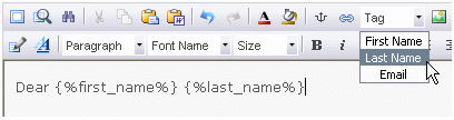 InnovaStudio WYSIWYG Editor has a Custom Tag Insertion feature. With this feature, you can insert predefined custom tags into the current Editor content. Custom Tag insertion is a feature that is commonly used in mailing applications or template editing in web content management systems. To use Custom Tag Insertion feature, set CustomTags collection property with Param object, for example :
