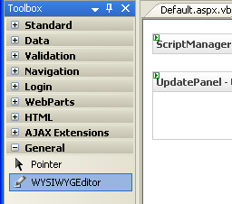 - In page design mode, click WYSIWYGEditor control in toolbox and drag to page. Visual Studio will automatically creates